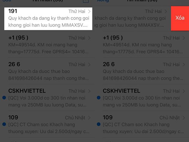 Trên iPhone, bạn có thể xóa nhanh các tin nhắn với công cụ 3D Touch. Để có thể xóa nhanh tin nhắn, bạn chỉ cần gạt tin nhắn sang phải. Sau đó bạn sử dụng 3D tác động lực vào phần “Xóa” để xóa nhanh tin nhắn.