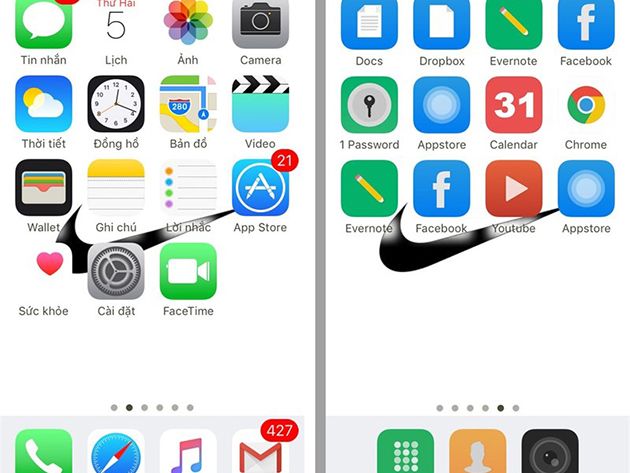 Cũng tương tự như ẩn tên các ứng dụng trên thanh dock, bạn cũng có thể ẩn tên các ứng dụng trên màn hình của mình. Bạn chỉ cần đưa ứng dụng mình muốn ẩn tên xuống thanh dock, sau đó thực hiện tương tự như các bước ở trên là đã có thể ẩn tên các ứng dụng trên màn hình chính của máy.