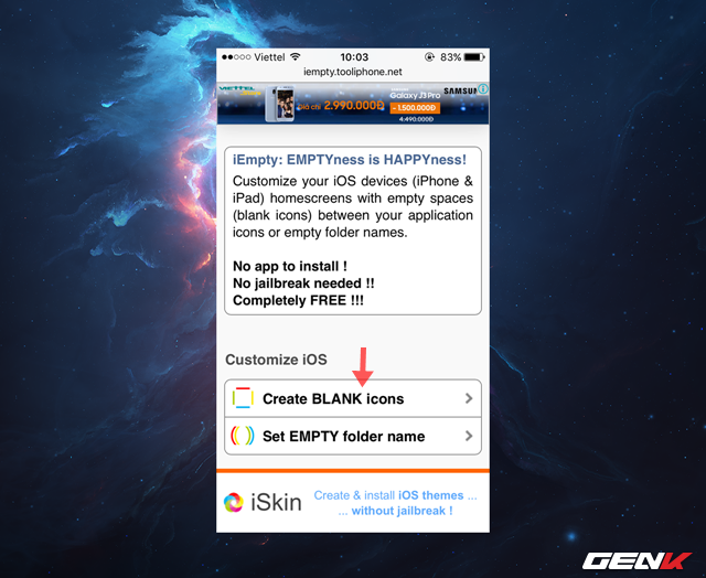 Mở trình duyệt web của iPhone lên và truy cập vào địa chỉ “iempty.tooliphone.net”. Sau đó nhấp vào lựa chọn “Create BLANK icons”.