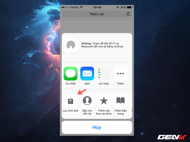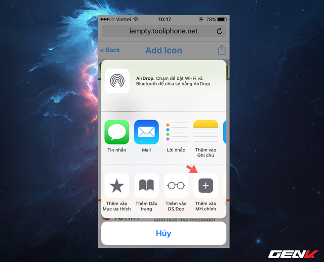 Nhấp vào biểu tượng “Share” ở thanh công cụ trình duyệt và chọn “Thêm vào MH chính”.