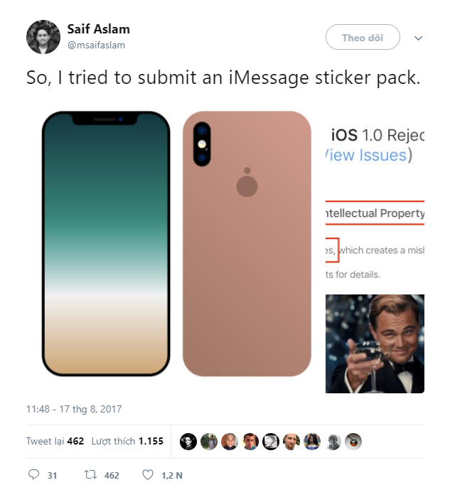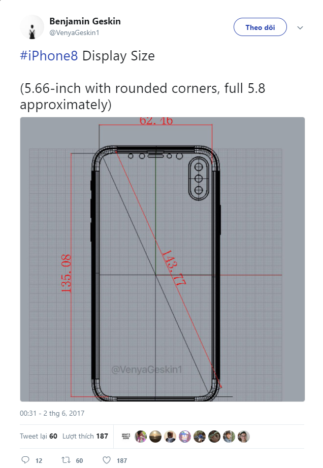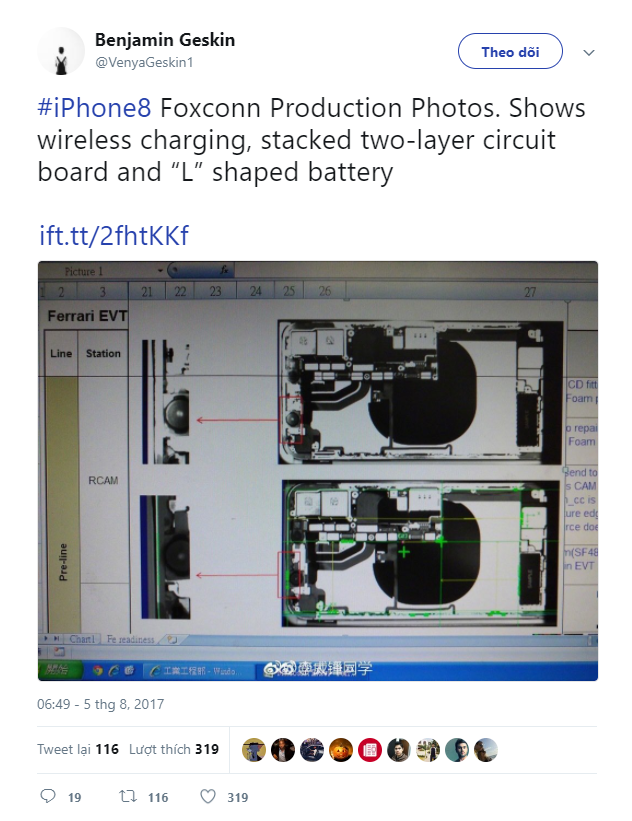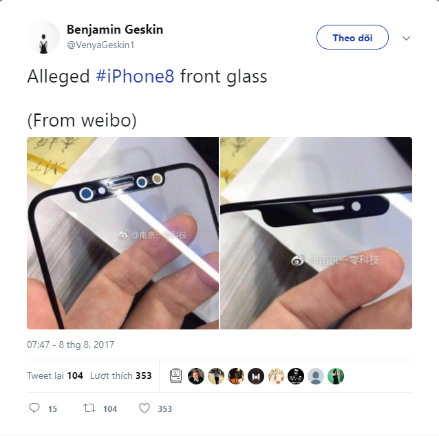 Tin đồn cũng được Benjamin Geskin ủng hộ trên Twitter, một nguồn cung cấp cho iPhone 8 rò rỉ trong vài tháng qua. Ông tuyên bố rằng một trong những lựa chọn màu sắc cho iPhone 8 sẽ là một gương giống như kết thúc.