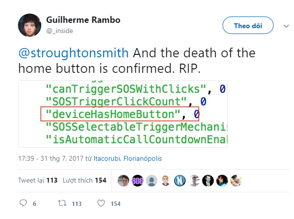 Người ta cũng tin rằng sẽ không có nút Home trên mặt trước của iPhone 8 (chúng ta sẽ thảo luận về ý nghĩa của điều này đối với Touch ID trong giây lát). Sự rò rỉ phần mềm HomePod được đề cập trước đây chứa mã đề cập đến một biến mới gọi là "deviceHasHomeButton" (có thể được gắn thẻ với một có hoặc không), có vẻ như là một gợi ý mạnh mẽ rằng điều này đang xảy ra.
