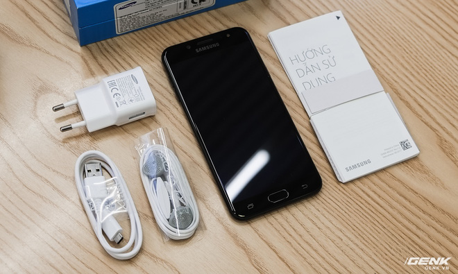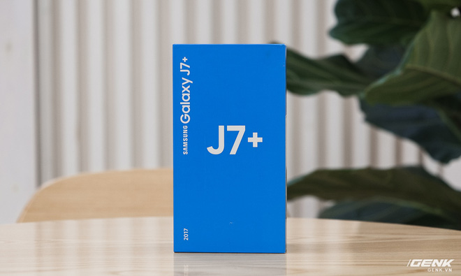 Vì là một sản phẩm tầm trung nên quy cách đóng gói của Galaxy J7+ cũng rất cơ bản. Máy nằm trong một hộp giấy màu xanh dương, bên ngoài chỉ in tên máy màu trắng và các thông tin quan trọng. Các khay đựng bên trong cũng làm bằng giấy và chứa đầy đủ những phụ kiện cơ bản, bao gồm sách HDSD, cáp USB, sạc, tai nghe và que lấy SIM.