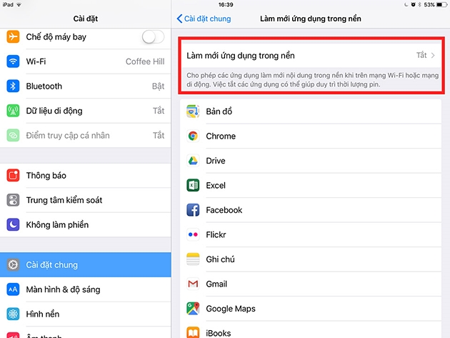 Cũng như các Widget, các ứng dụng chạy nền sẽ làm máy hao pin nhanh hơn và luôn trong tình trạng hoạt động. Hãy truy cập vào Cài đặt > Cài đặt chung > Làm mới Ứng dụng Trong nền và bỏ chọn những ứng dụng mà bạn không muốn cho chạy nền đi là được.