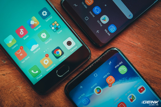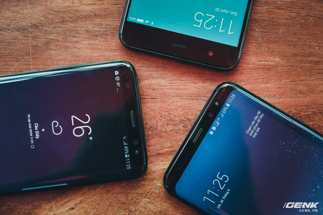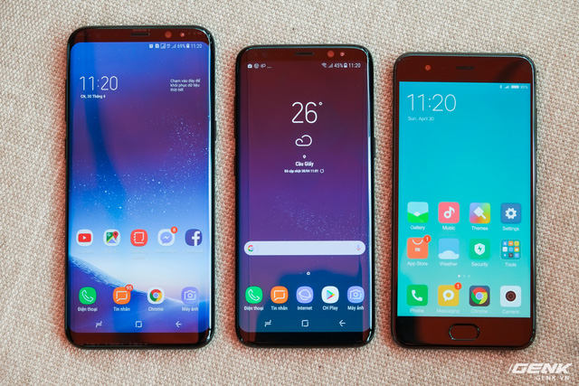 Từ trái qua phải: Galaxy S8+, Galaxy S8 và Mi 6. Có thể thấy, Mi 6 (5.15 inch) có kích thước gần như tương đồng so với Galaxy S8 (5.8 inch), trong khi sở hữu màn hình nhỏ hơn. Trong khi đó, Galaxy S8+ mặc dù có màn hình rất lớn lên đến 6.2 inch nhưng cũng chỉ dài hơn Mi 6 chứ không to hơn đáng kể về chiều ngang.