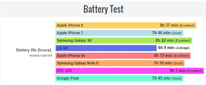 iPhone 8 hỗ trợ sạc nhanh nhưng rất tiếc lại không đi kèm với bộ sạc nhanh trong hộp. Theo thử nghiệm của PhoneArena, iPhone 8 mất 148 phút để sạc đầy pin theo cách thông thường. Trong khi đó, sạc lâu nhất là iPhone 6s với 150 phút. HTC U11 và LG G6 gây ấn tượng với thời gian sạc chỉ 98 và 97 phút tương ứng.