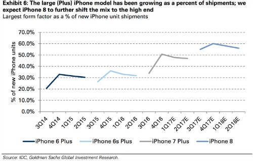 Trước đó, vào năm 2014, doanh thu từ iPhone 6 Plus chiếm tới 32% doanh thu mảng iPhone. Vào năm ngoái, iPhone 7 Plus cũng chiếm tới 60% trên tổng doanh thu mảng iPhone.